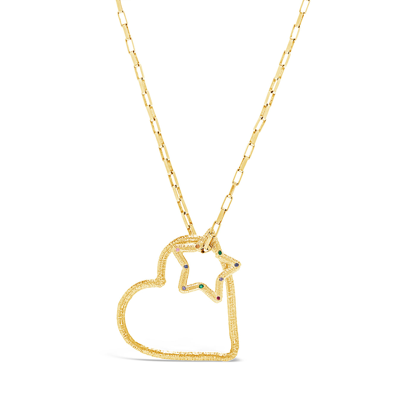 18K Textured Yellow Gold, Multi-Colored Sapphire & Emerald (0.10cttw)Dimensions: 3.3cm x 3.3cm Heart, 18" Chain