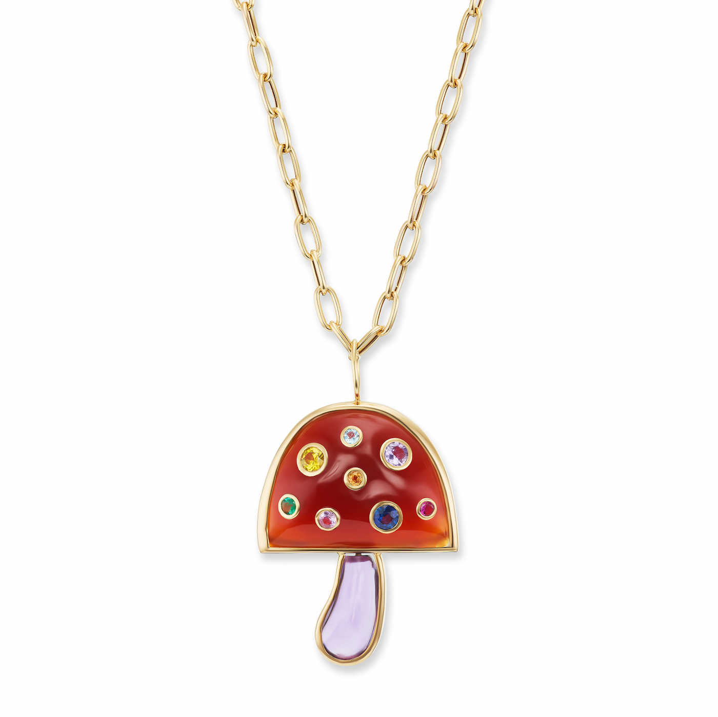 18K Yellow Gold, Carved Carnelian and Amethyst, Rainbow Sapphires & EmeraldDimensions: 4cm x 3cm Mushroom, 18" Chain