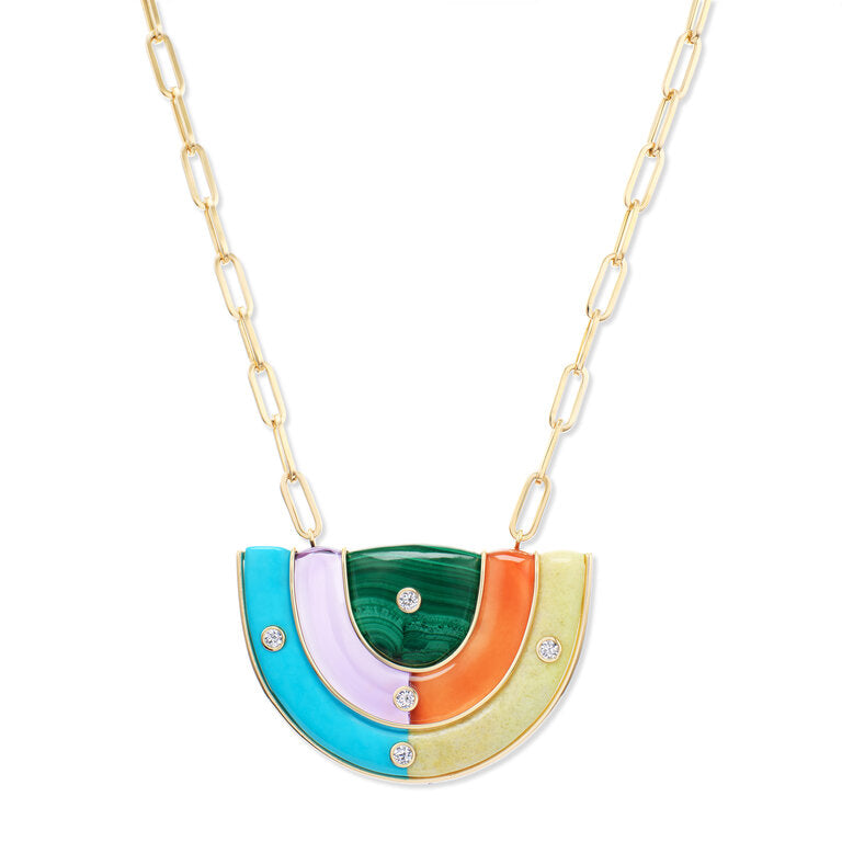 18K Yellow Gold, Carved Stone, Diamonds (~1.3cttw)Carved Malachite, Amethyst, Carnelian, Turquoise, Brazilian OpalDimensions: 14" chain, 3" x 2" pendant