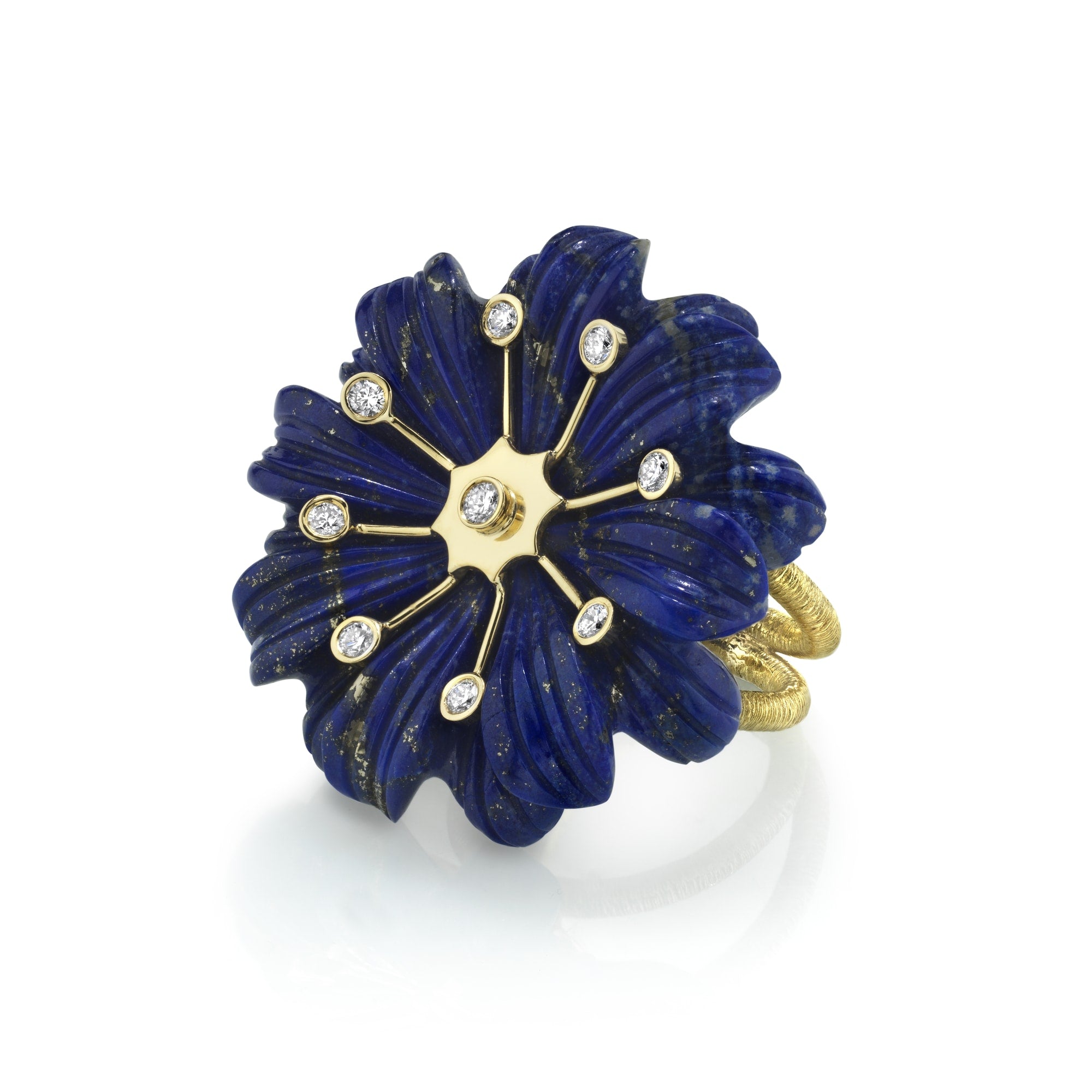 18K Yellow Gold Textured Band, Carved Lapis, White Diamond Sputnik (0.45cttw)