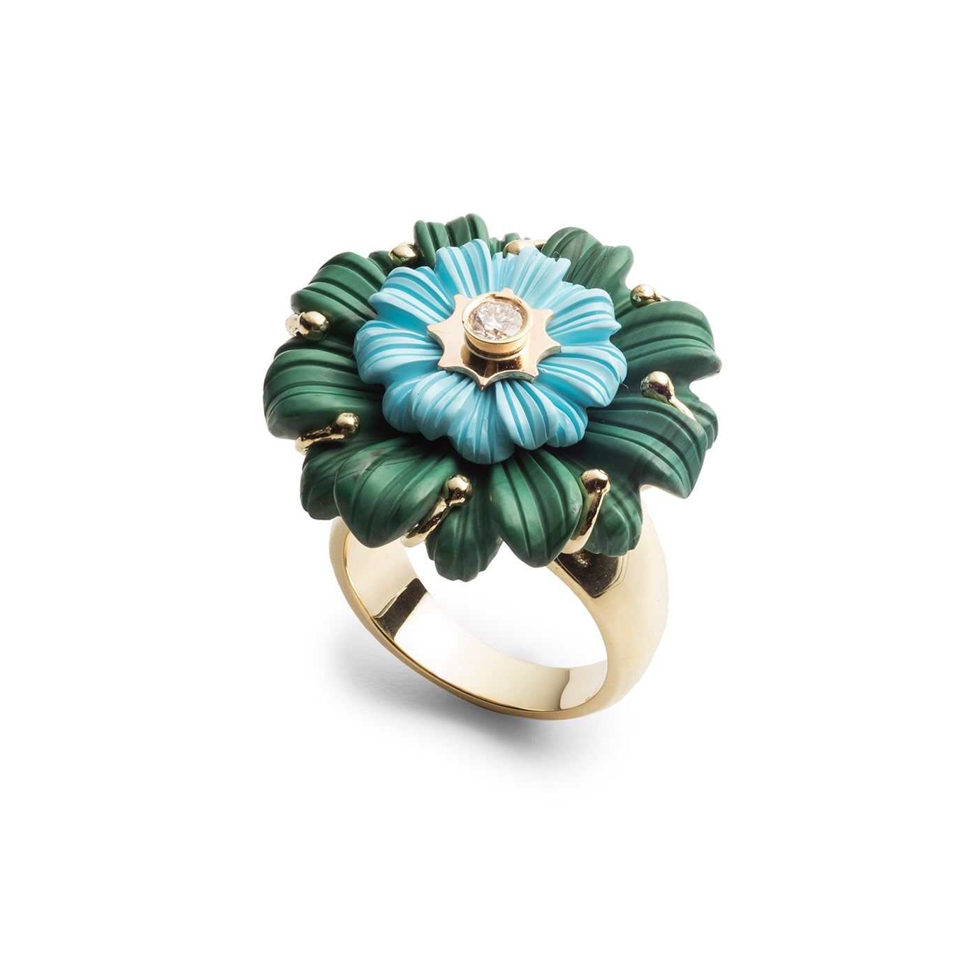 18K Yellow Gold, Malachite (32ct), Re-constituted Turquoise (3ct), Diamond (0.20ct)Dimensions: 26.5mm Diameter