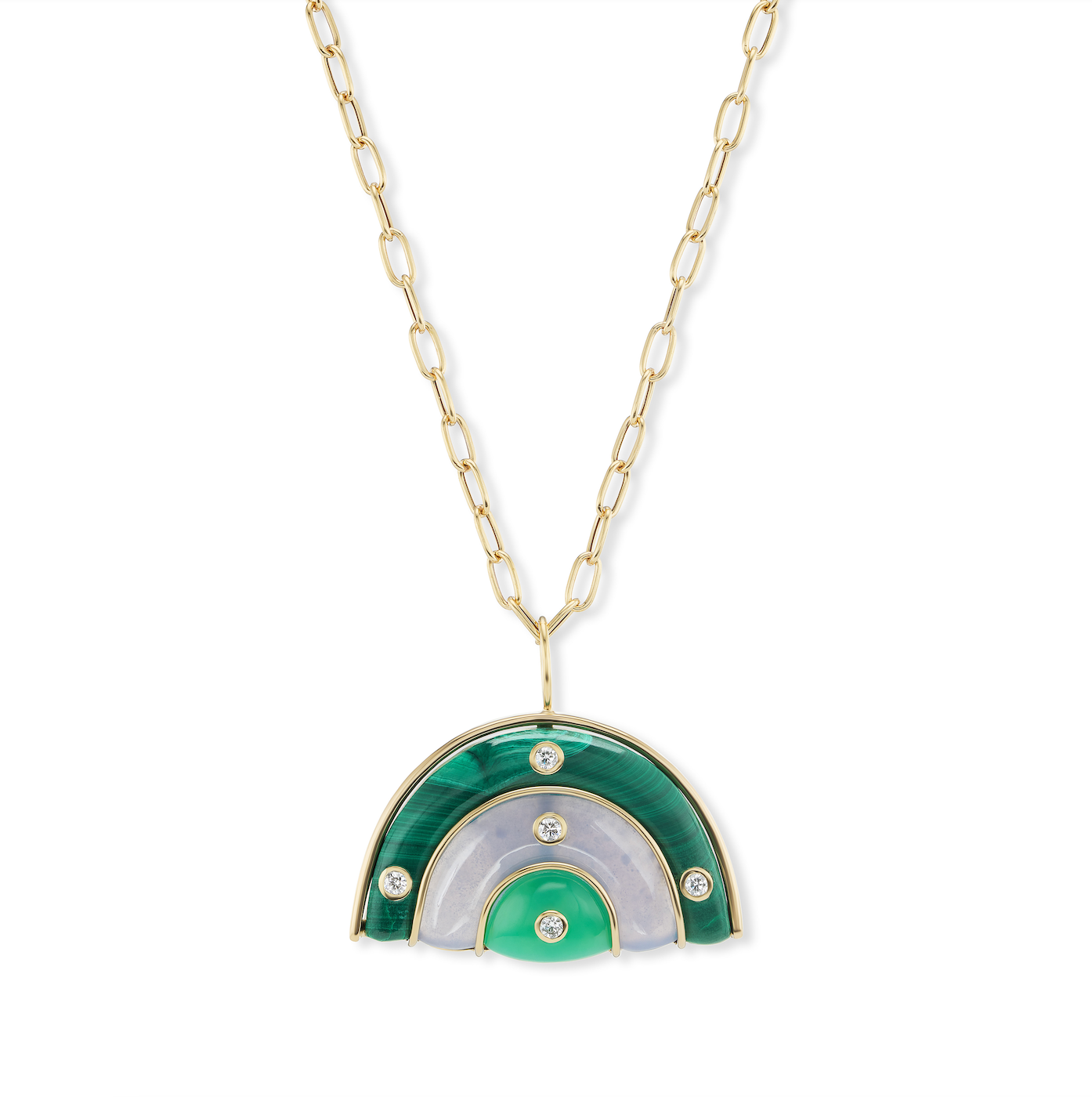 18K Yellow Gold, Carved Stone, Diamonds (~0.32cttw)Carved Malachite, Blue Chalcedony, Chrysoprase Dimensions: 32" chain, 1.8" x 1.25" pendant