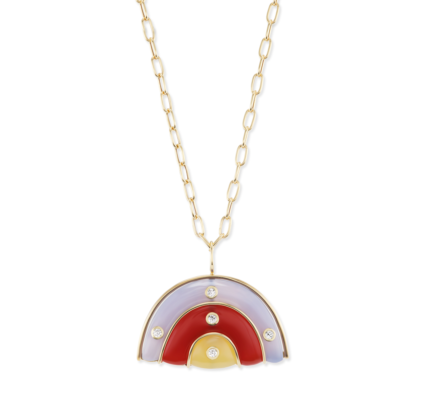 18K Yellow Gold, Carved Stone, Diamonds (~0.32cttw)Carved Blue Chalcedony, Carnelian, Yellow OpalDimensions: 32" chain, 1.8" x 1.25" pendant