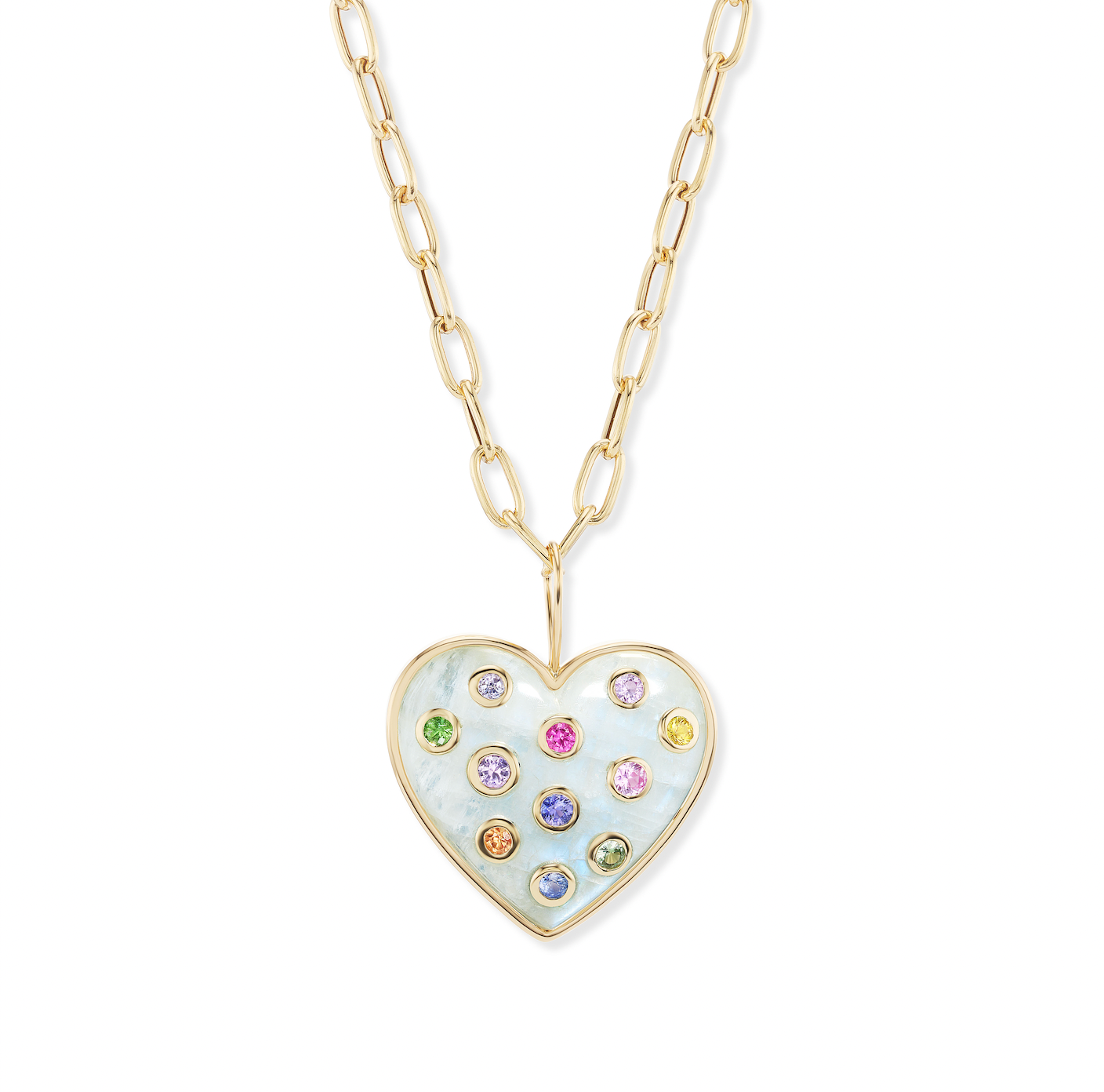 18K Yellow Gold, Carved Rainbow Moonstone, Rainbow SapphiresDimensions: 1.17" x 1.05" Pendant, 18" Chain