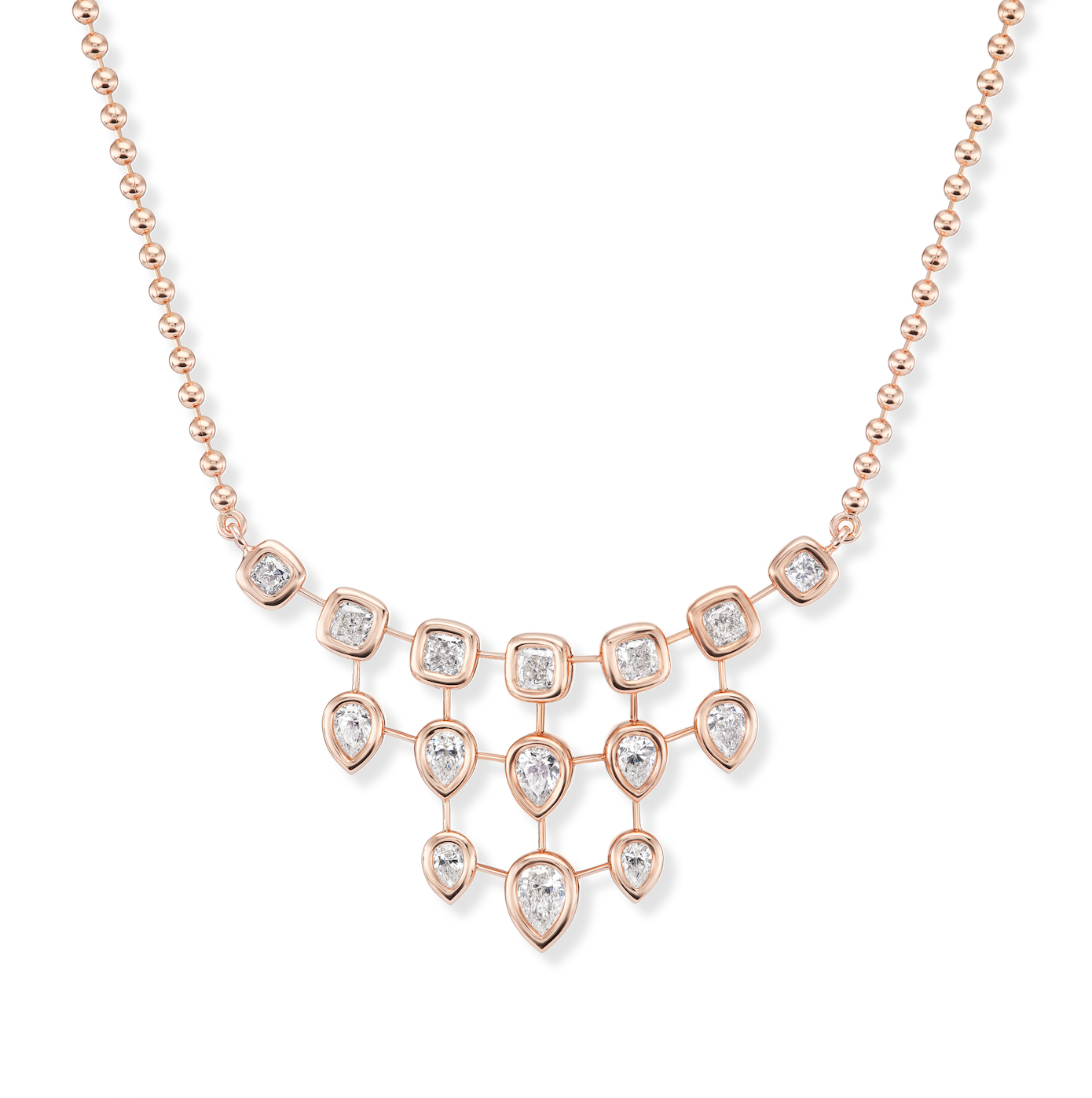 18K Rose Gold, Cushion Cut Diamonds (2.12cts), Pearshape Diamonds (3.55cts)Dimensions: Bib is 1.6" long x 2.1" wide, 15" long around the neckOne-of-a-KindPrice Upon Request