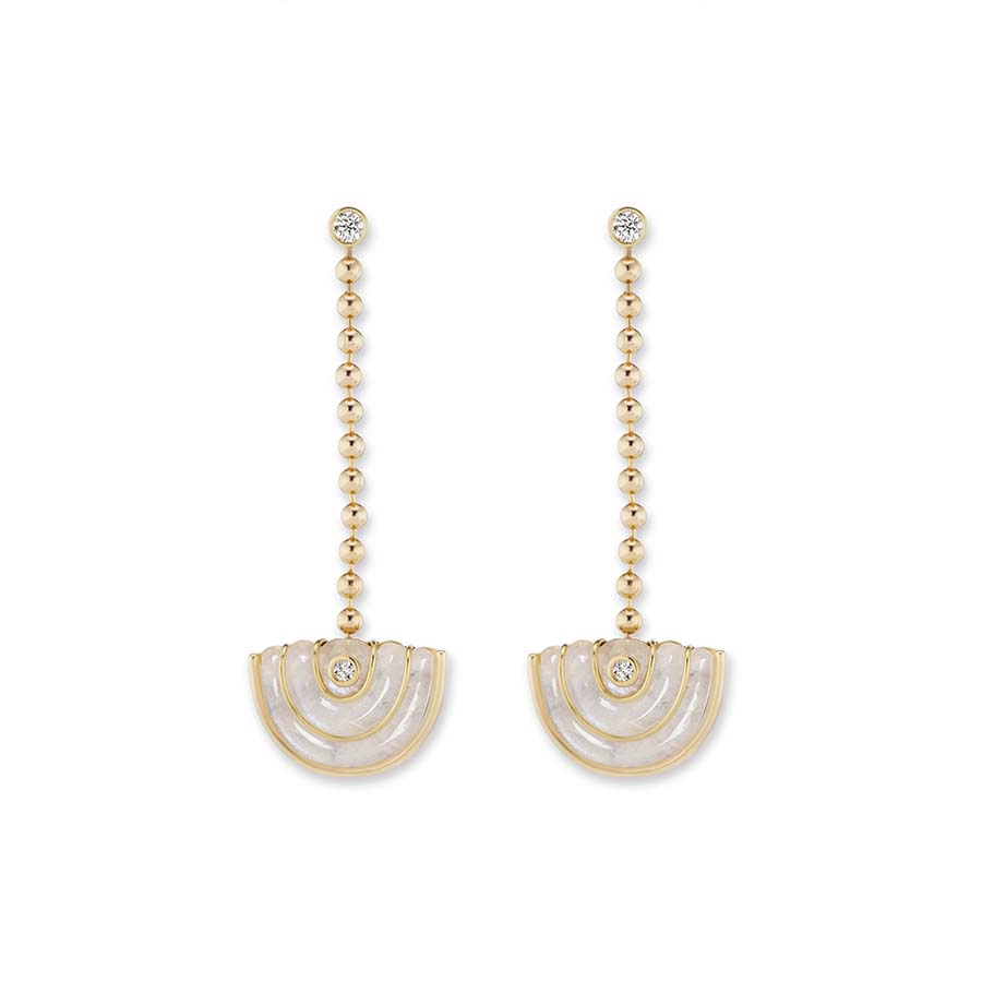 18K Yellow Gold, Carved Stone, Diamond (~0.45cttw)Carved Rainbow MoonstoneDimensions: 2.5" long x 1" wide