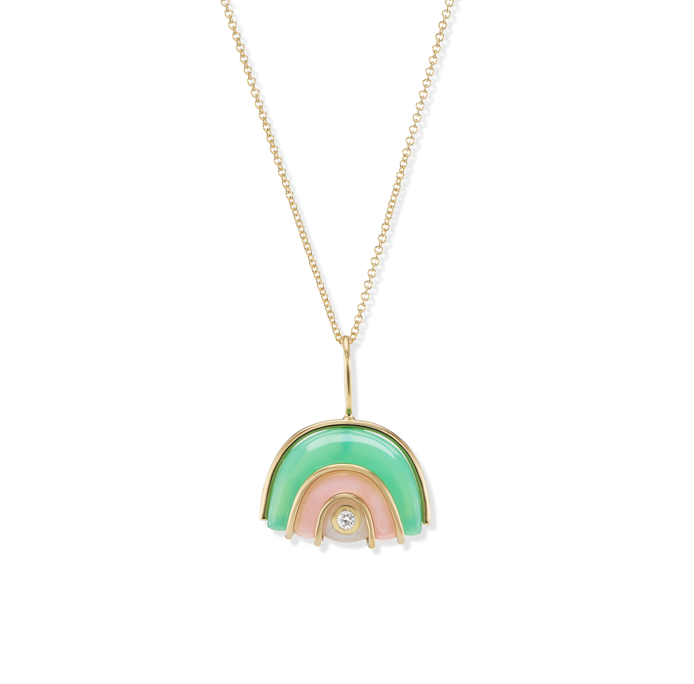 18K Yellow Gold, Carved Stone, Diamond (~0.06ct)Carved Chrysoprase, Pink Opal, Rainbow MoonstoneDimensions: 16" total length, 1" x 0.8" pendant