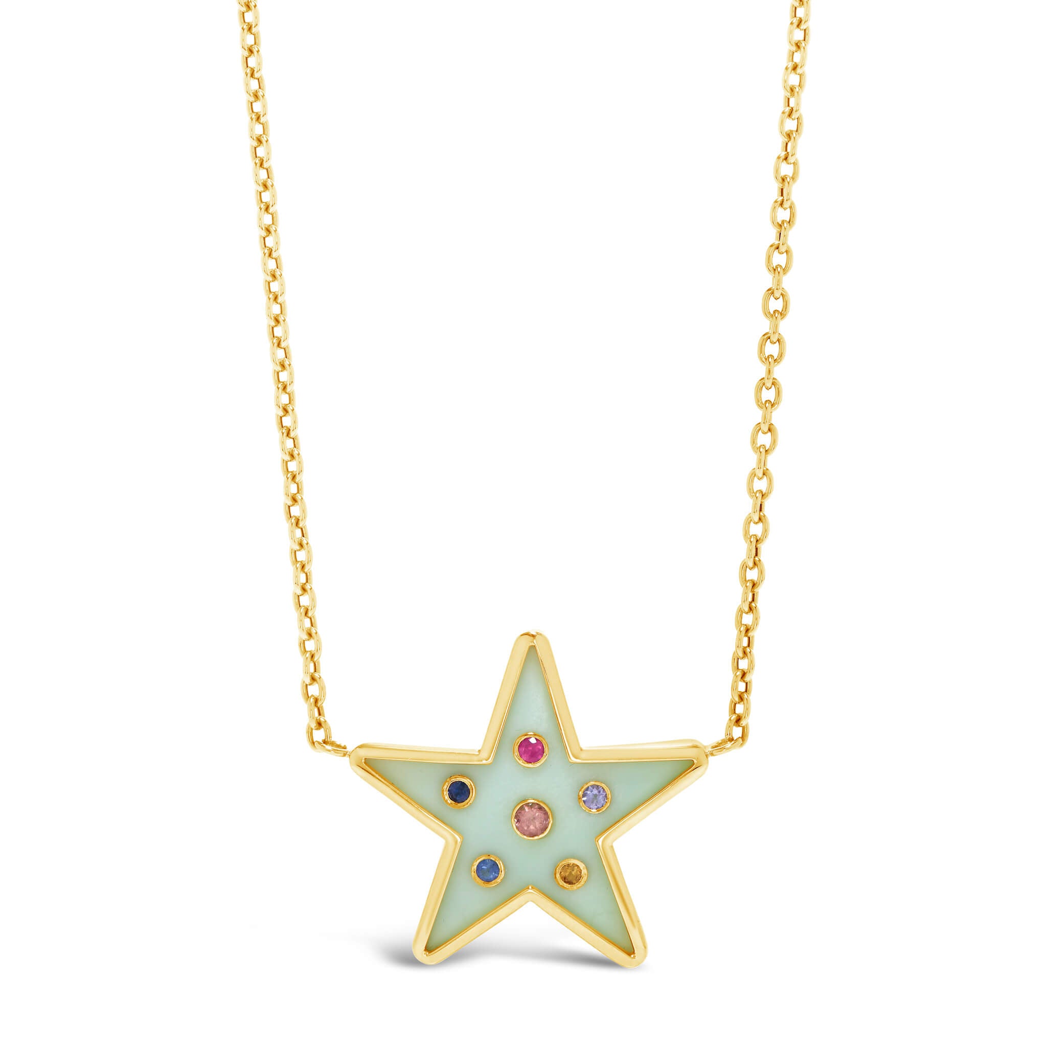 18K Gold with Peruvian Opal Inlay & Multi-colored Sapphire InsetsDimensions: 3.5cm Pendant, Stationary 19" Chain