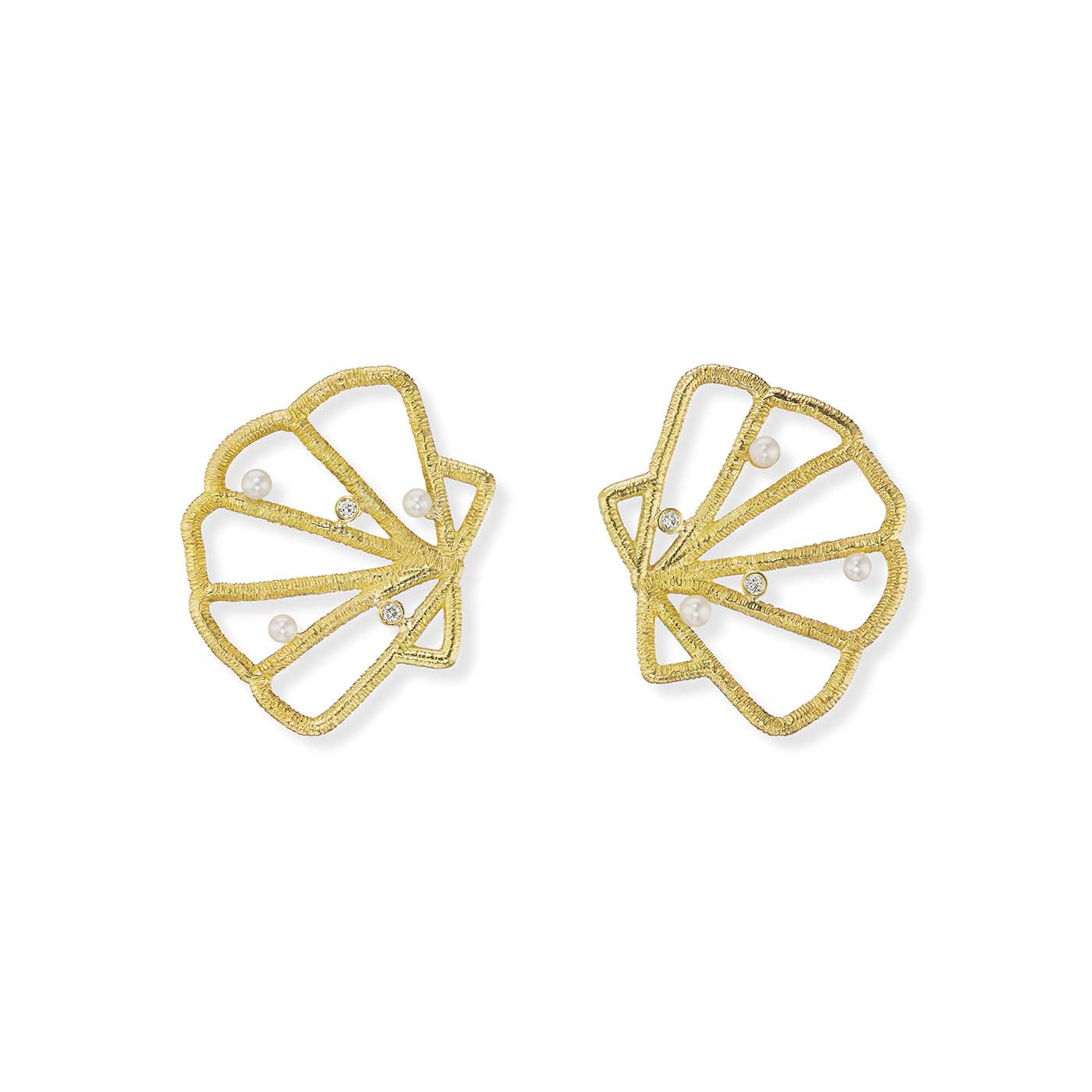 18K Textured Yellow Gold, White Diamonds, Cultured Pearls